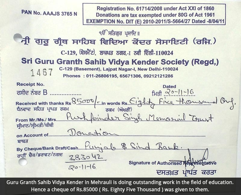 Aid to Guru Granth Sahib Vidya Kender Mehrauli